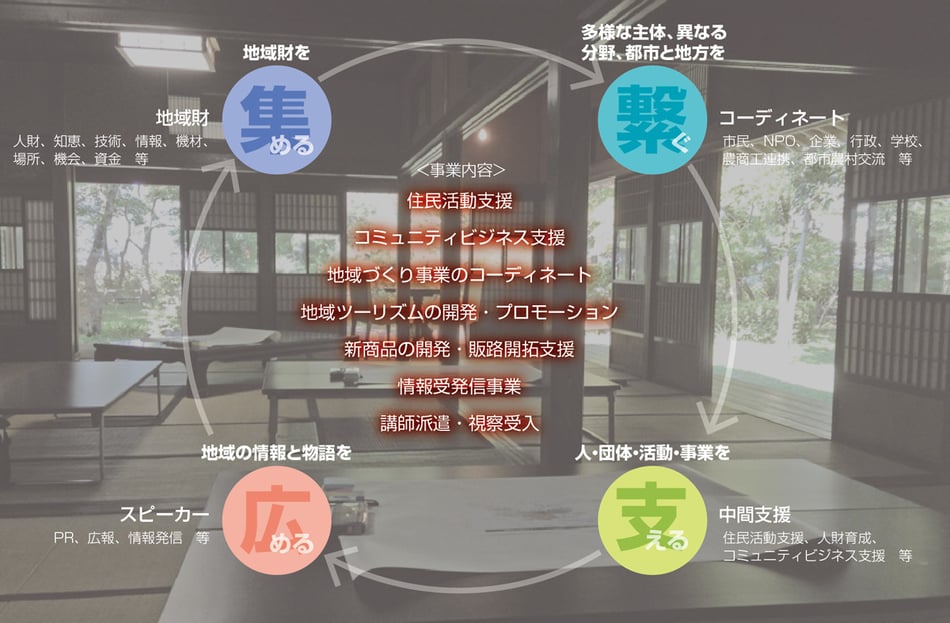 新潟県村上地域(1市2村)をフィールドに、地域密着型・コーディネート型の中間支援組織として、「集める」「つなぐ」「支える」「広める」という4つをぐるぐるまわしながら、日々活動を展開しています。